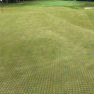 On Tuesday, the front nine greens were aerated. This process took longer than we wanted due to the cloudy conditions delaying the topdressing sand from drying. A crucial part of the greens aeration process is the incorporation of topdressing sand into the green. Basically we punch a lot of holes into the green and then fill them with the topdressing sand. Getting that sand into the holes is accomplished largely through the use of a cart pulled drag brush and finally by crew members using hand brooms. Dry sand is required for this process to work effectively. Dragging wet sand simply smears the sand along the surface of the green and over the top of the aeration holes rather than filling them. It is also extremely rough and causes damage to the greens surface. The rainy conditions today will prevent us from completing aeration to the back 9 greens as originally planned. Thus unfortunately we will need to use the third "rain day" of aeration and keep the back 9 greens closed Thursday. Below are some pictures from aeration this week.